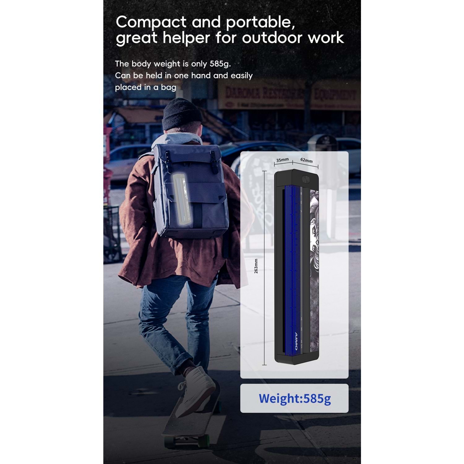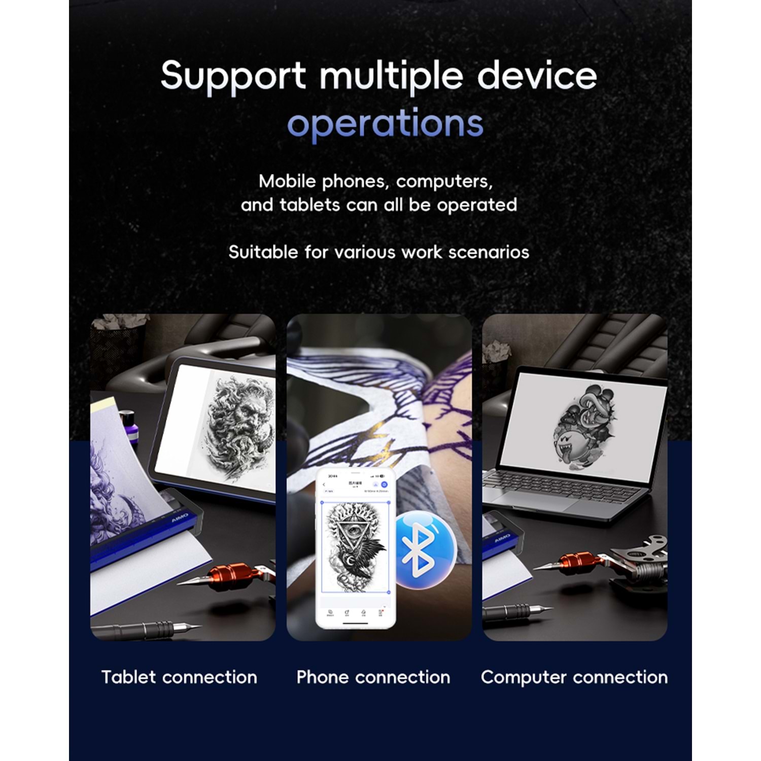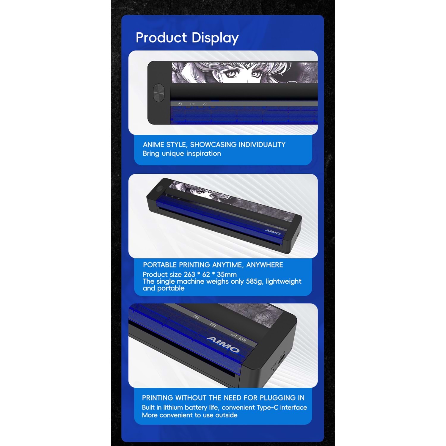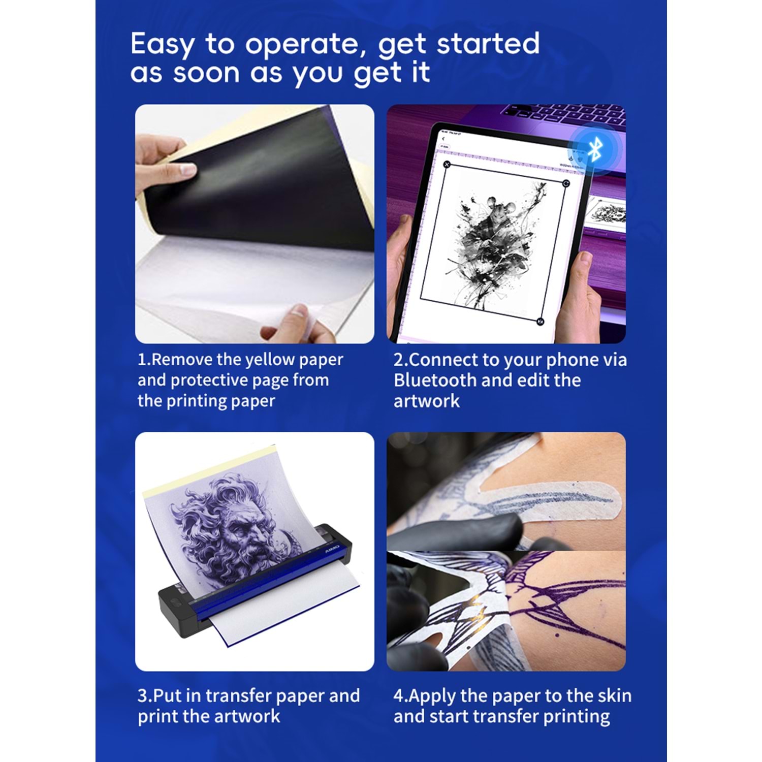 Dimensions: 262 (L) × 57(W) × 29(H) mm Weight: 715g Print Resolution: 8 dots / mm (203dpi),1728 dots / line Print speed: Up to 15mm/s Print width: 216mm Media Type: 210mm*297mm A4 thermal paper A4 ve roll thermal kağıd kullanıma uygundur Taşıma klıfı kutu içerisindedir Sarj edilebilir Bettery:11.1V Li-ion, 1200mAh(build-in)Bettery Life about 200 documents with 12.5% pattern, about 80 regular images (medium density) Input voltage: Type-C, 5.0V--2.0A TPH life: 50km Interface: type-c-usb data communication, Bluetooth 5.0 Dövme Şablonu Harici Word Text Pdf baskısıda alınabilinir